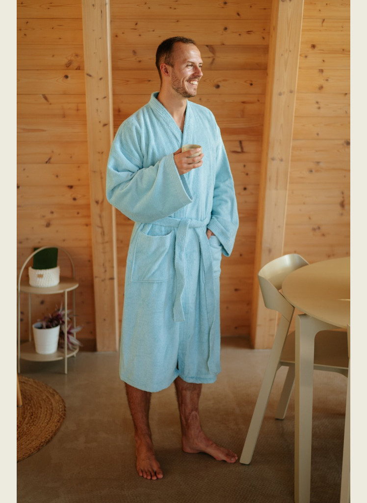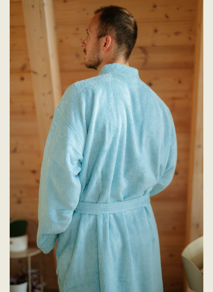 Materiál: 60 % bavlna, 40 % bambus Barva: světle modrá Úprava textilu: froté Střih županu: KIMONO, unisex Gramáž: 420 g/m² (kilt a župan), 500 g/m² (osuška) Rozměr kiltu: 60 × 140 cm (standardní velikost) Detaily kiltu: kapsička, zapínání na knoflíčky, pružný pás Rozměr osušky: 90 x 150 cm