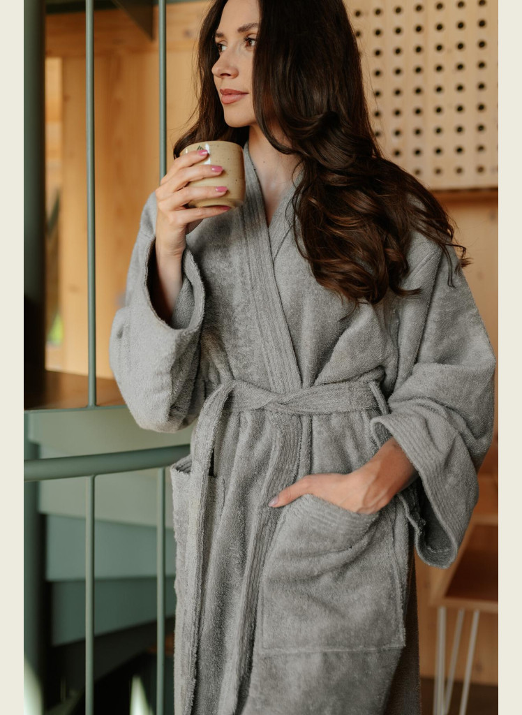 Materiál: 60 % bavlna, 40 % bambus Barva: světle šedá Úprava textilu: froté Střih: kimono, unisex Gramáž: 420 g/m²