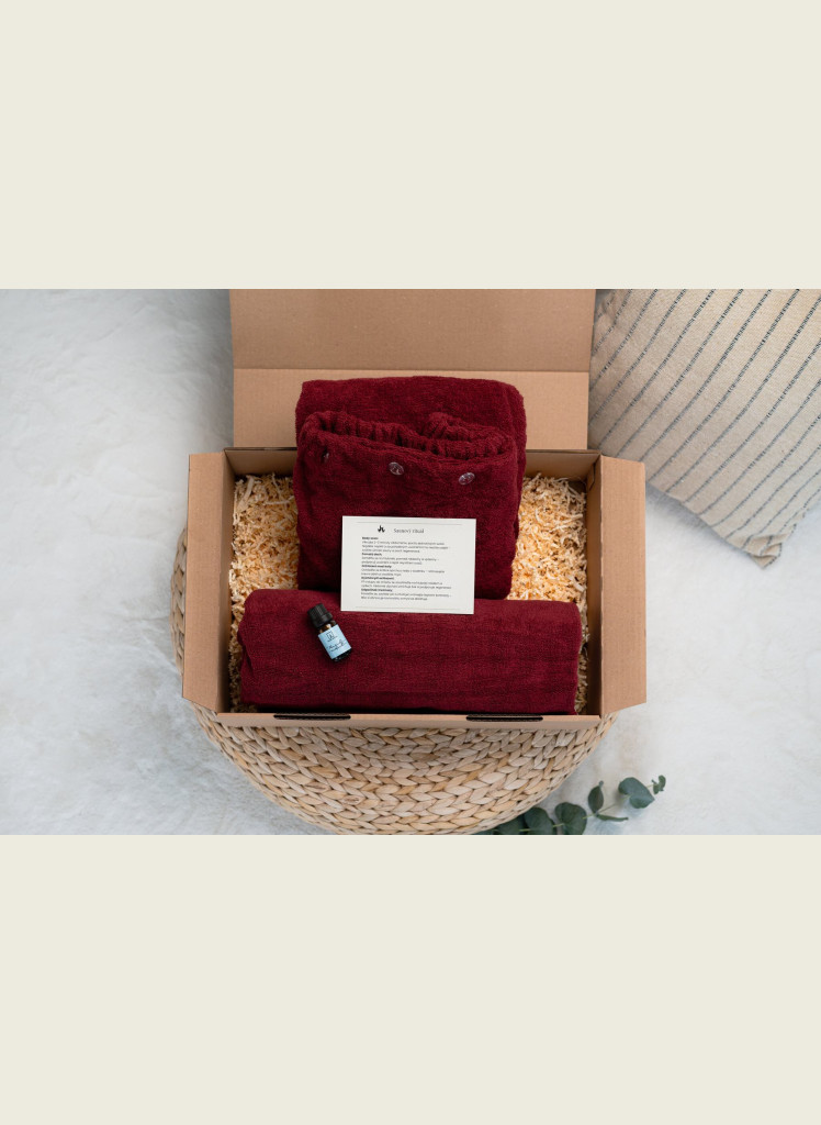 Sada pro skutečný saunový zážitek. Praktický saunový kilt se zapínáním na knoflíčky, kapsičkou a pružným pasem poskytuje pohodlí, volnost pohybu a možnost použití přímo v sauně i mezi jednotlivými koly. Osuška ve stejné barvě ho skvěle doplňuje.