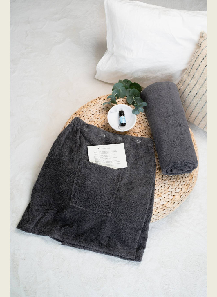 Sada pro skutečný saunový zážitek. Praktický saunový kilt se zapínáním na knoflíčky, kapsičkou a pružným pasem poskytuje pohodlí, volnost pohybu a možnost použití přímo v sauně i mezi jednotlivými koly. Osuška ve stejné barvě ho skvěle doplňuje.