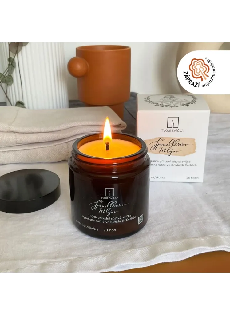 ŠPINDLERŮV MLÝN – česká vonná svíčka inspirovaná svěžími tóny grepu a hřejivosti skořice.