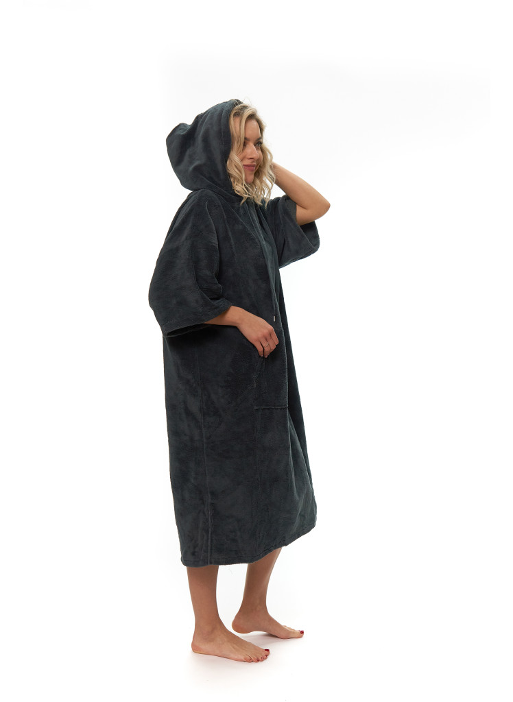Vnější mikroplyšová vrstva je jemná na dotek a působí luxusně. Díky této kombinaci materiálů pončo dobře schne a zároveň poskytuje pohodlí a hřejivost.