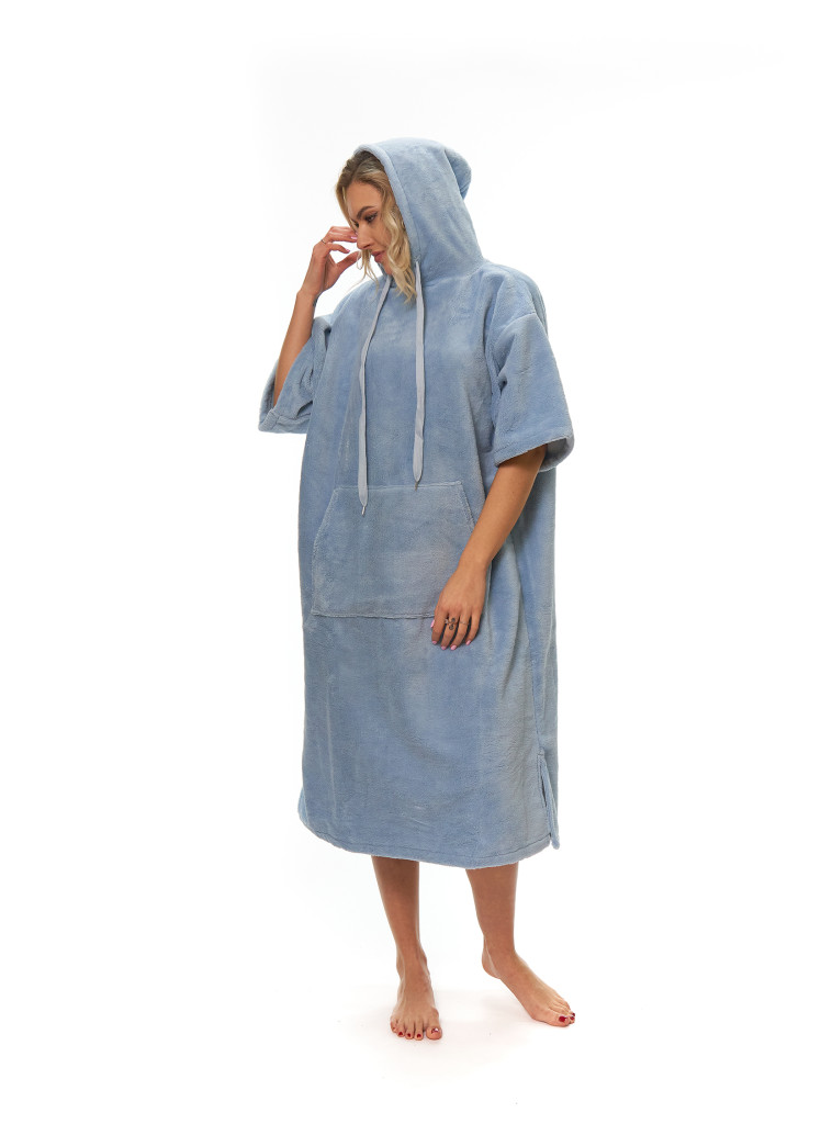 Pončo se snadno přetáhne přes hlavu a poskytne pohodlný úkryt. Jeho střih umožňuje rychlé převlékání z mokrých plavek. Kapuce se šňůrkou chrání hlavu před sluncem a větrem, zatímco klokaní kapsa zahřeje ruce.