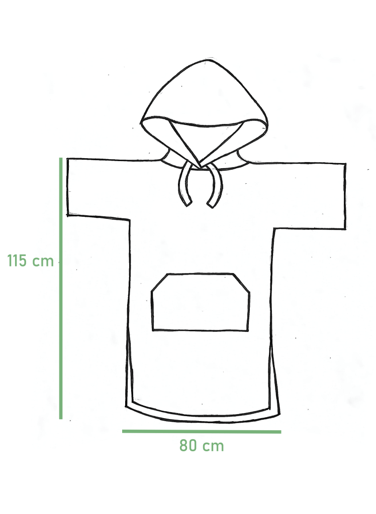 Pončo se snadno přetáhne přes hlavu a poskytne pohodlný úkryt. Jeho střih umožňuje rychlé převlékání z mokrých plavek. Kapuce se šňůrkou chrání hlavu před sluncem a větrem, zatímco klokaní kapsa zahřeje ruce.